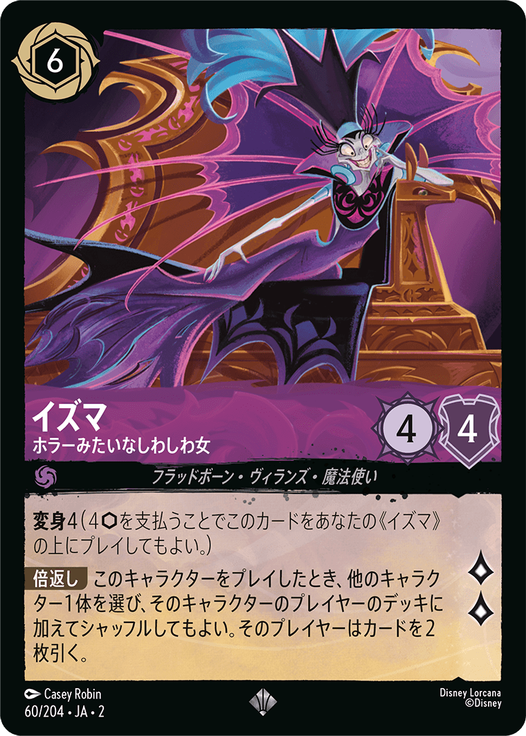 このキャラクターをプレイしたとき、他のキャラクター1体を選び、そのキャラクターのプレイヤーのデッキに加えてシャッフルしてもよい。そのプレイヤーはカードを2枚引く。