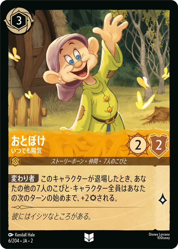 このキャラクターが退場したとき、あなたの他の7人のこびと・キャラクター全員はあなたの次のターンの始めまで、+2される 。