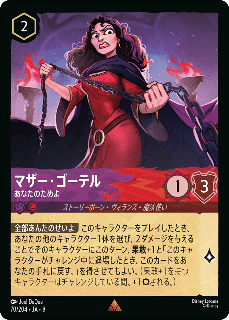 このキャラクターをプレイしたとき、あなたの他のキャラクター1体を選び、2ダメージを与えることでそのキャラクターにこのターン、果敢+1と「このキャラクターがチャレンジ中に退場したとき、このカードをあなたの手札に戻す。」を得させてもよい。(果敢+1を持つキャラクターはチャレンジしている間、+1