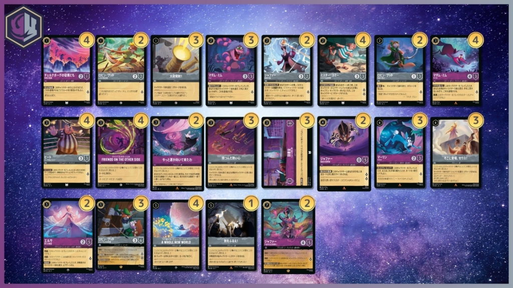 「アメジスト/ルビー」 Disney LORCANA公式HP「ディズニーロルカナ グランプリ 2025 Autumn 京都」、TOP4選手プロフィール!記事 参考 キャラクターカード(41枚) チェルナボーグの従僕ども 邪悪の眷属 4枚 魔法のほうき イルミナの保守係 4枚... -