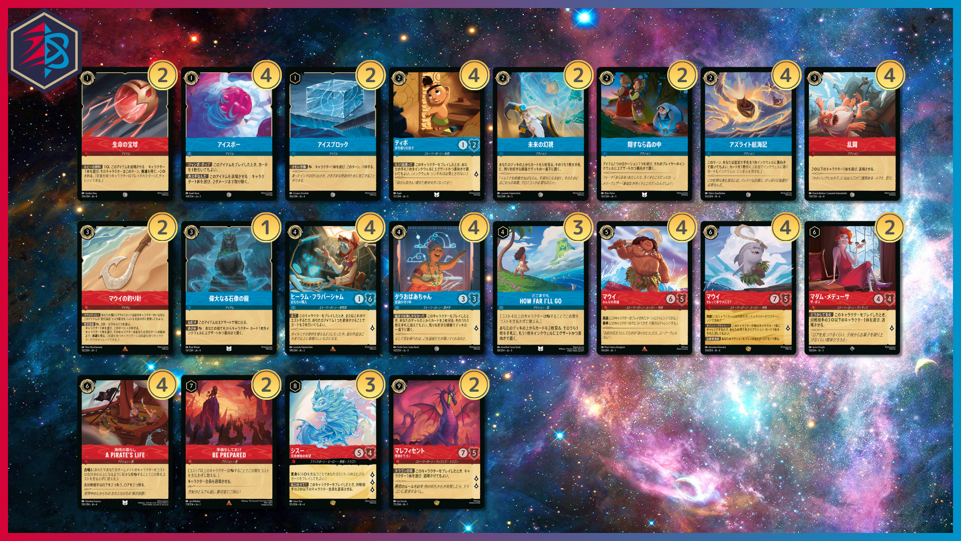 「ルビー/サファイア インクブースト」 Disney LORCANA公式HPディズニーロルカナ 最新デッキ情報局 Vol.14 記事 参考 キャラクター 28枚 4枚 4枚 4枚 4枚 4枚 2枚 3枚 3枚 アクション 21枚 2枚 2枚 4枚 4枚 3枚 4枚 2枚 アイテム 11枚 2枚 4枚 2枚 2枚 1枚 ロケーション 0枚 デッキ