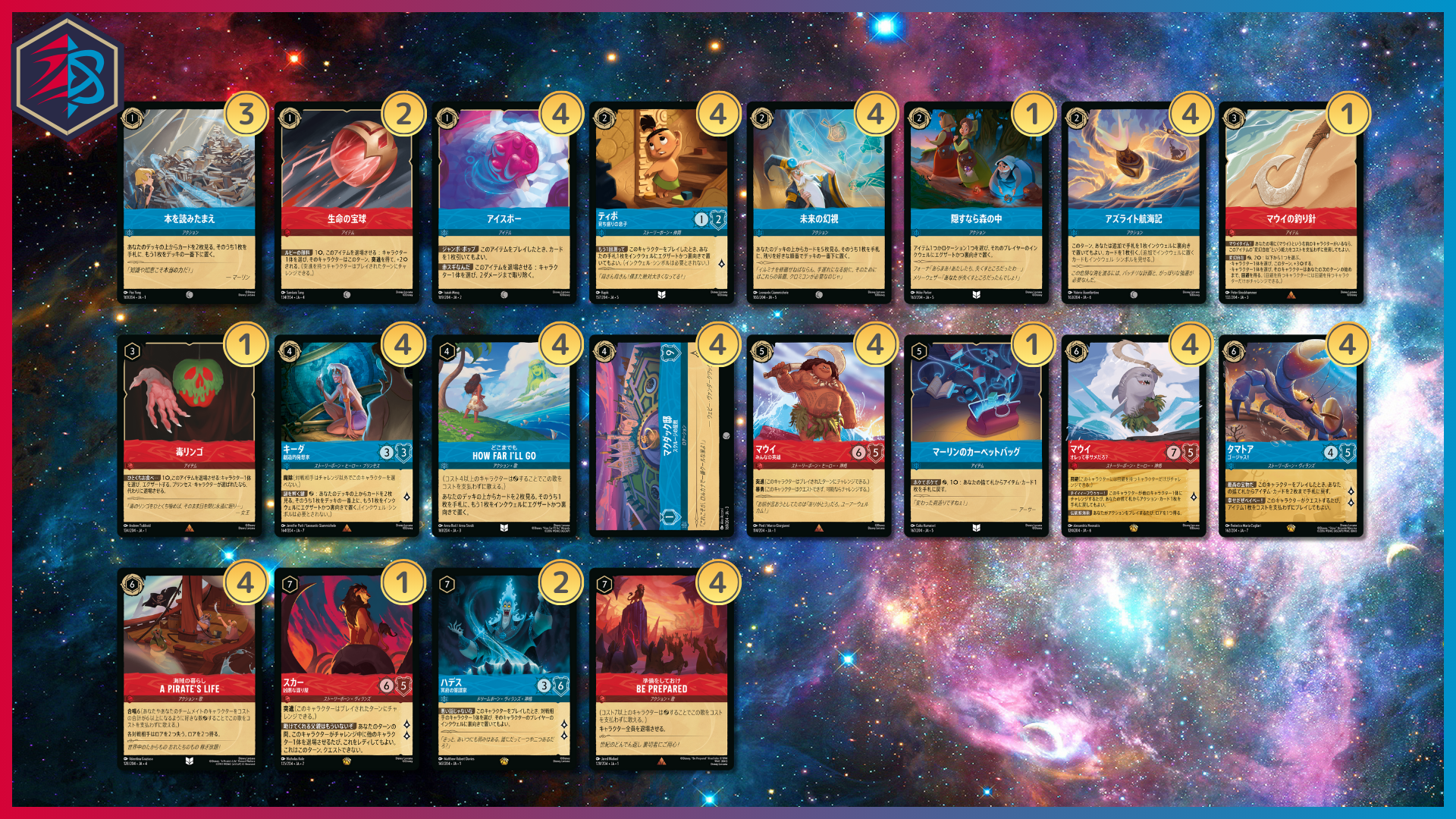 「ルビー/サファイア・インクブースト」 Disney LORCANA公式HP「ディズニーロルカナ チャレンジ 2026 Spring 東京」、TOP8選手プロフィール! 記事 参考 キャラクター 23枚 4枚 4枚 4枚 4枚 4枚 1枚 2枚 アクション 24枚 3枚 4枚 1枚 4枚 4枚 4枚 4枚 アイテム 9枚 2枚 4枚 1枚 1枚 1枚 ロケーション 4枚 4枚 デッキ
