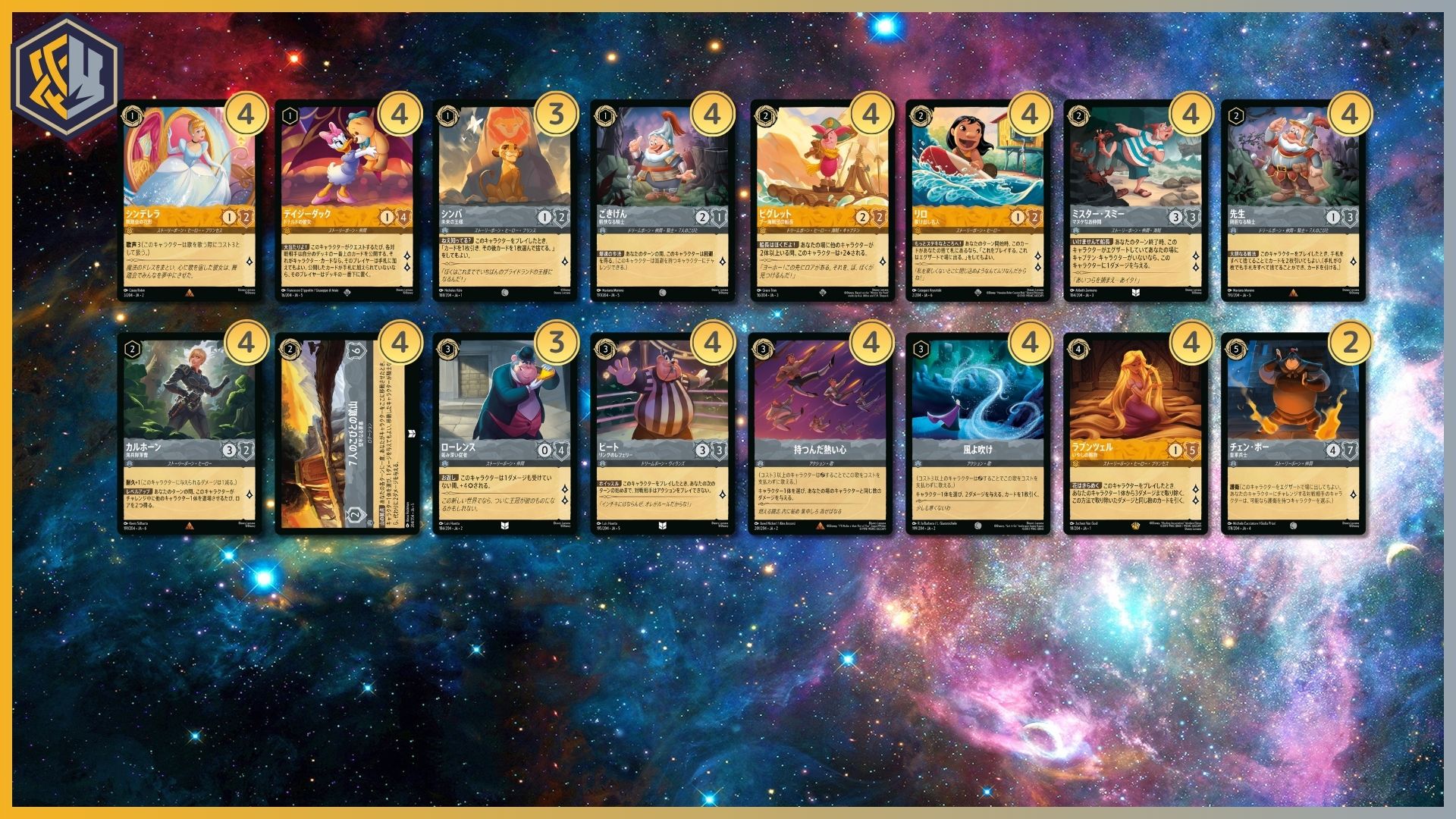 「アンバー/スティール 鉱山アグロ」 Disney LORCANA公式HPディズニーロルカナ 最新デッキ情報局 Vol.12 記事 参考 キャラクター 48枚 4枚 4枚 3枚 4枚 4枚 4枚 4枚 4枚 4枚 3枚 4枚 4枚 2枚 アクション 8枚 4枚 4枚 アイテム 0枚 ロケーション 4枚 4枚 デッキ