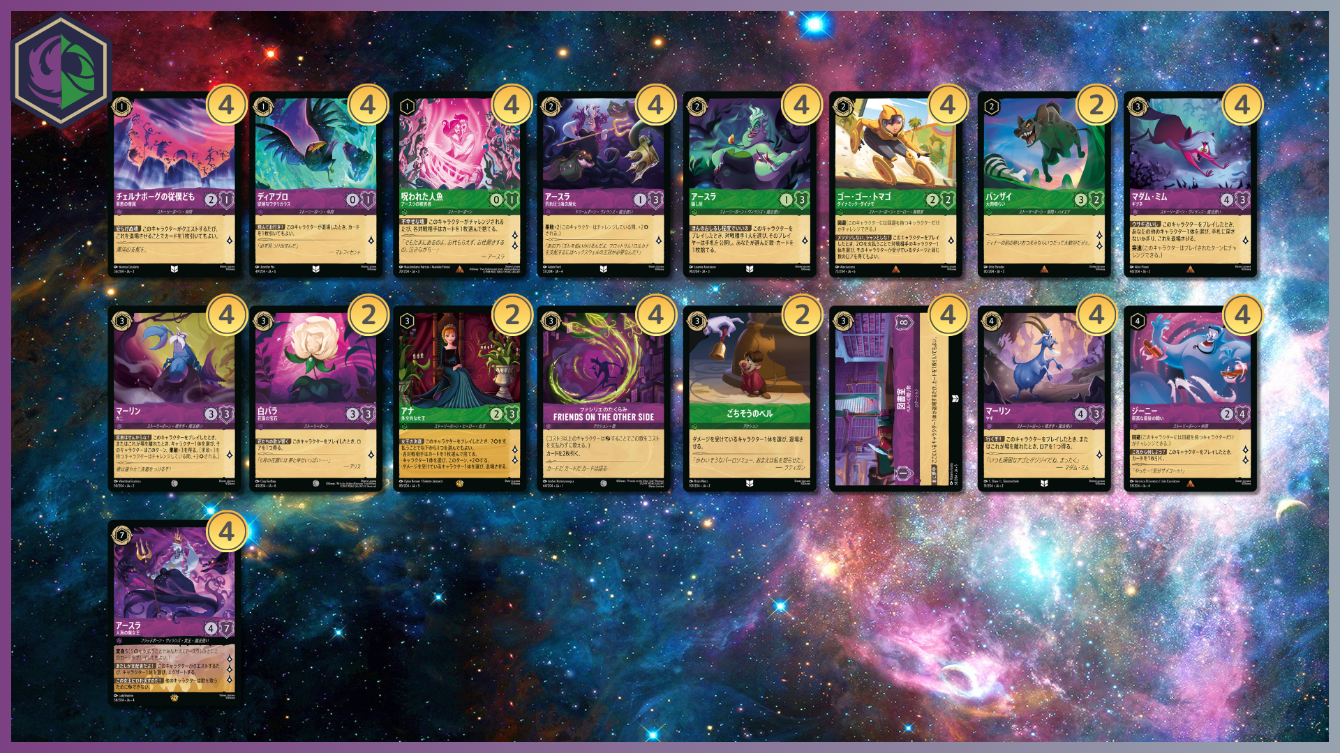 【LORCANA公式HP紹介デッキ】6弾環境「セット チャンピオンシップ」優勝:トレカショップLIG:キノカ選手「アメジスト/エメラルド ミッドレンジ」