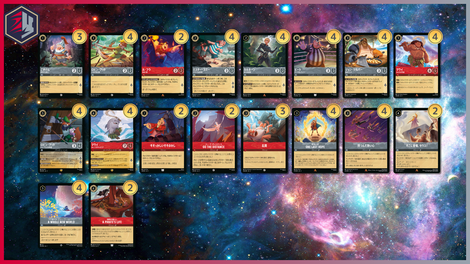 「ルビー・スティール マウイコンボ」 ディズニーロルカナ【公式】【【対戦】TCGプロとロルカナ開発者が激突! 原根健太vsスティーブ・ワーナー|大いなるアズライト】 紹介 キャラクター 37枚 3枚 4枚 2枚 4枚 4枚 4枚 4枚 4枚 4枚 4枚 アクション 23枚 2枚 2枚 3枚 4枚 4枚 2枚 4枚 2枚 アイテム 0枚 ロケーション 0枚 デッキ